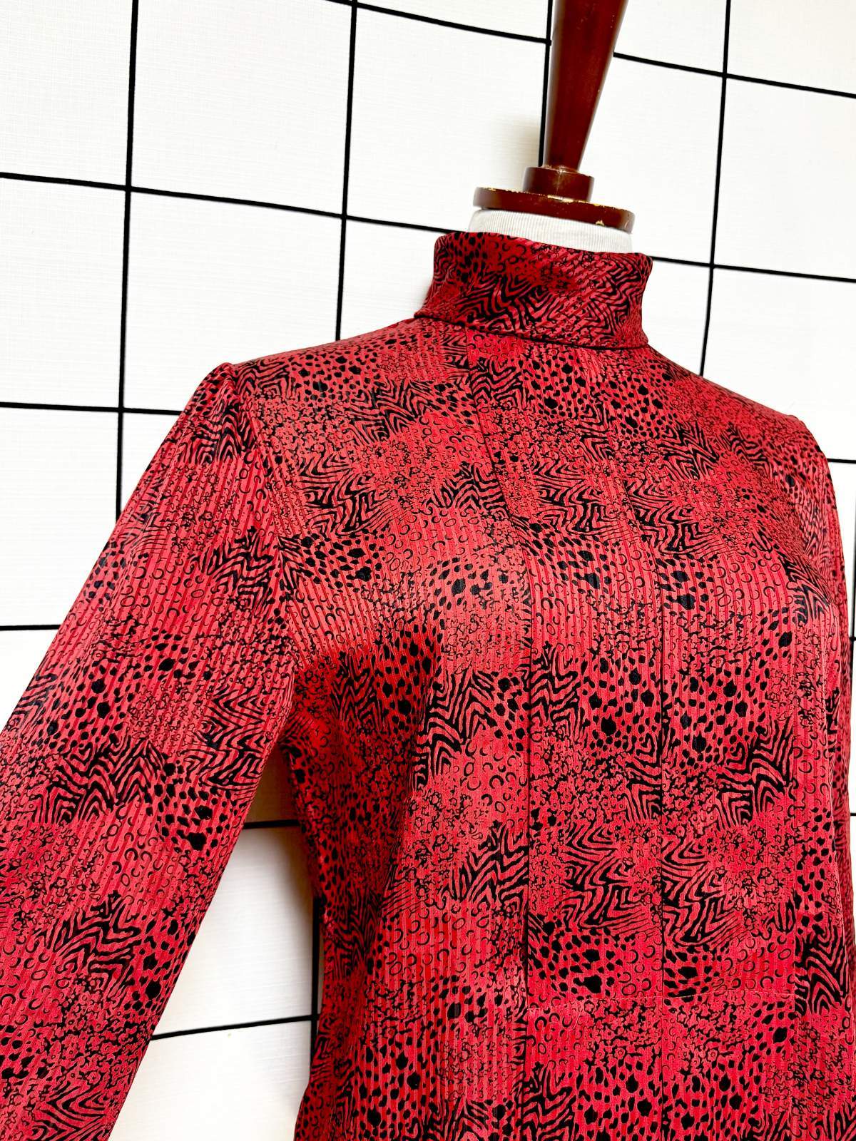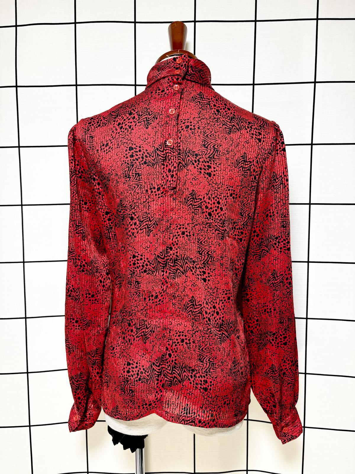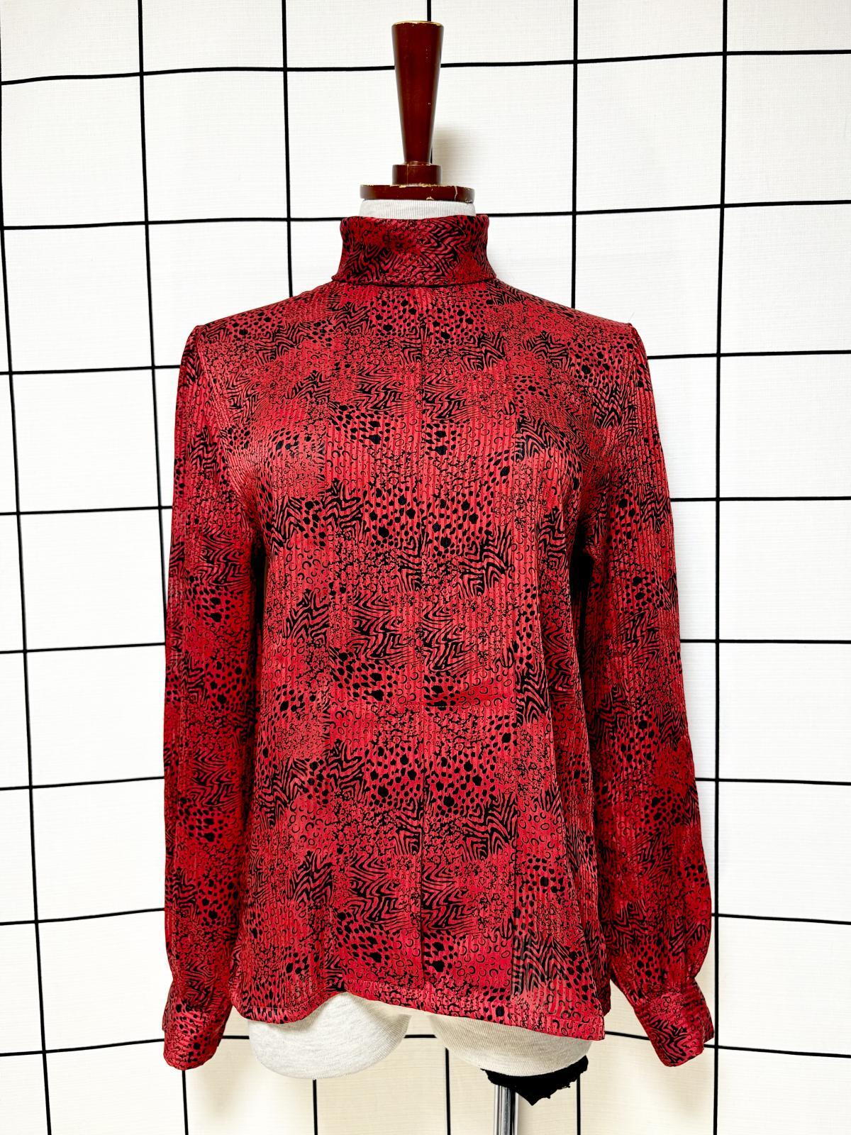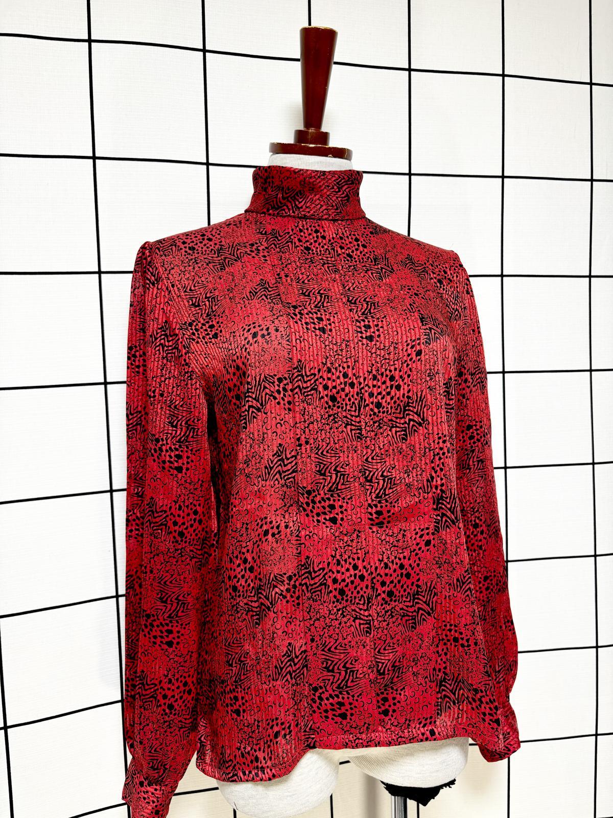 アート柄 ストライプ ハイネック レッド ブラック レトロ USA古着 長袖 シャツ ヴィンテージトップス [10109]