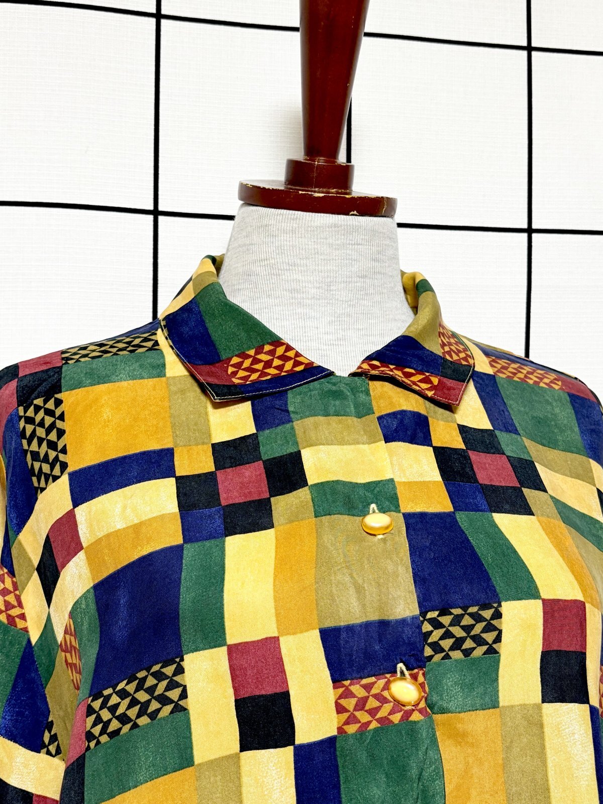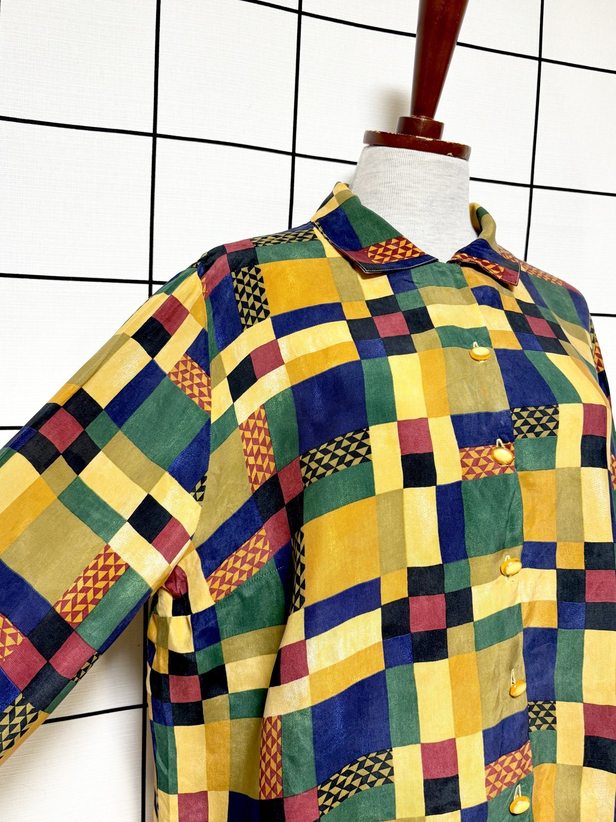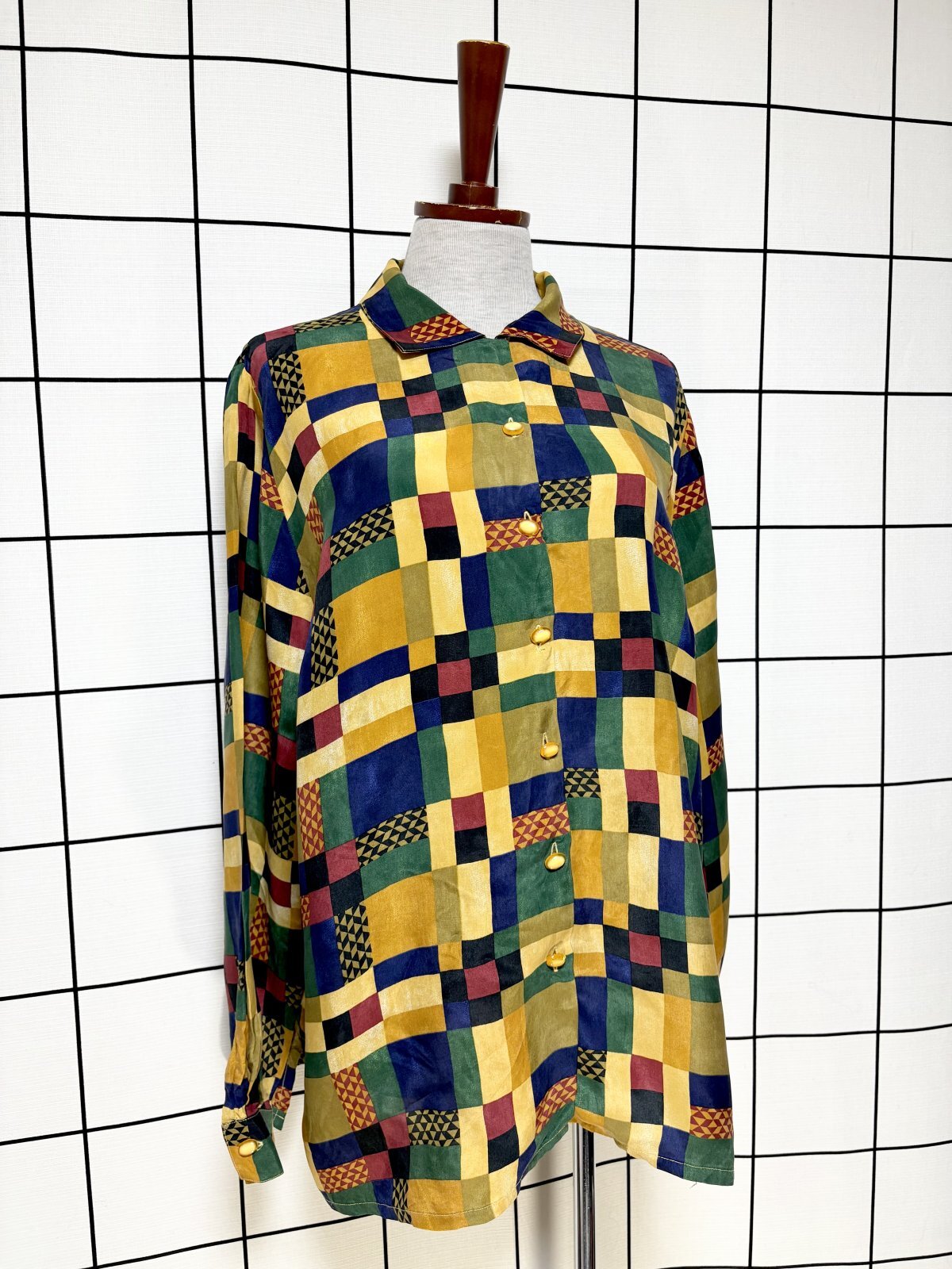 チェック柄 オーバーサイズコーデにも キュプラ レトロ ヨーロッパ古着 長袖 シャツ ヴィンテージブラウス [M10393]