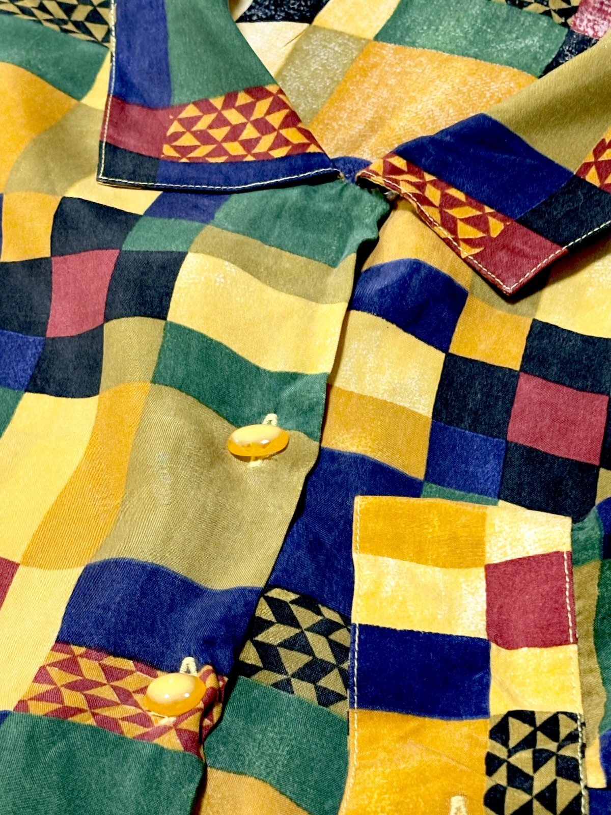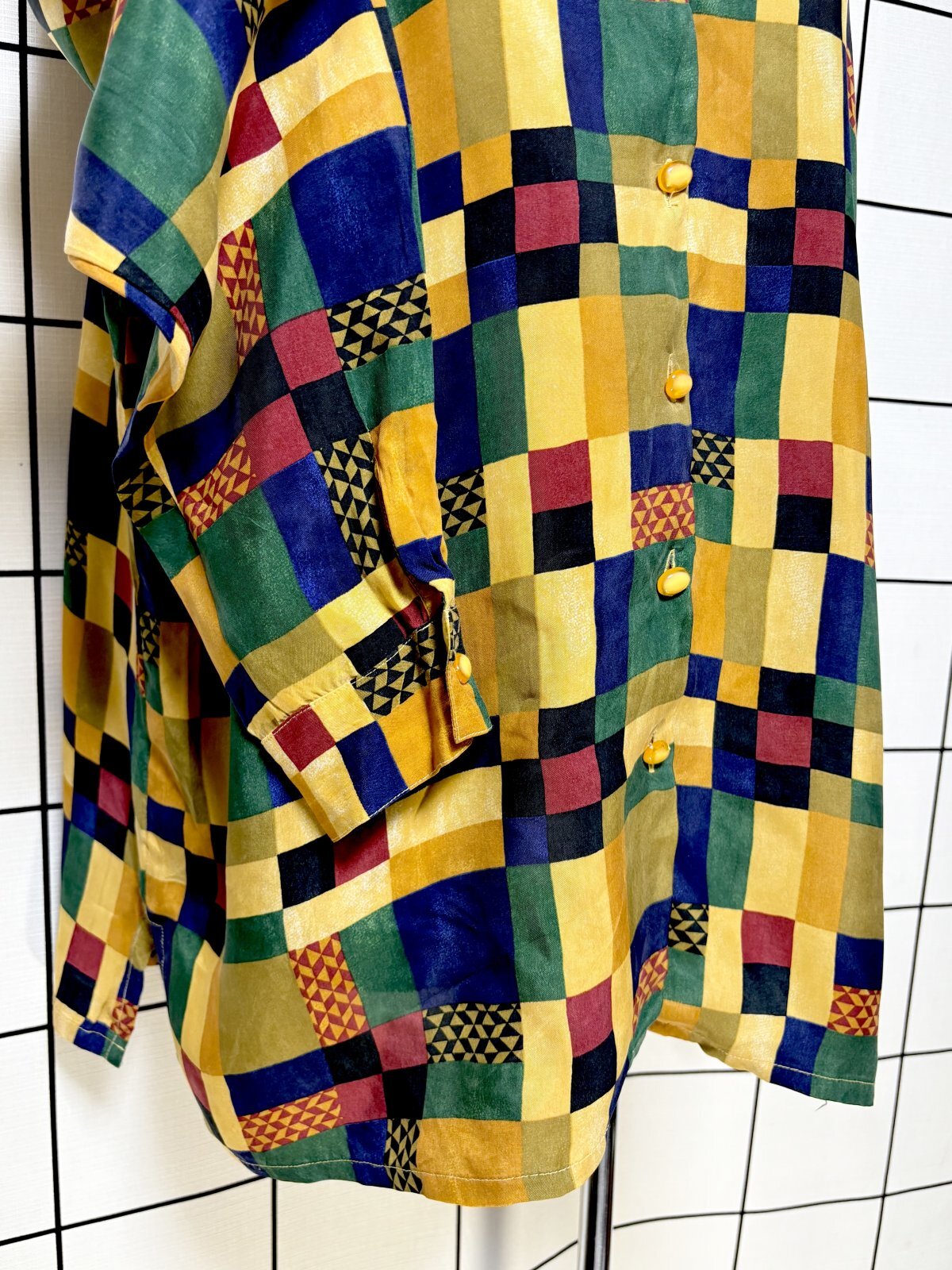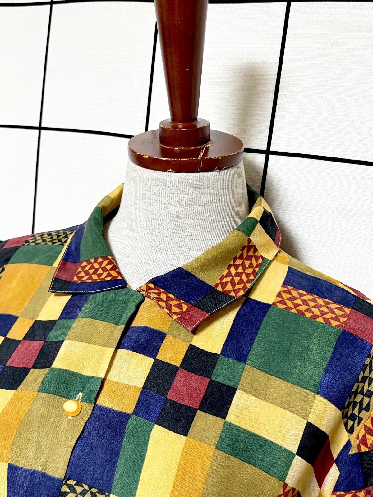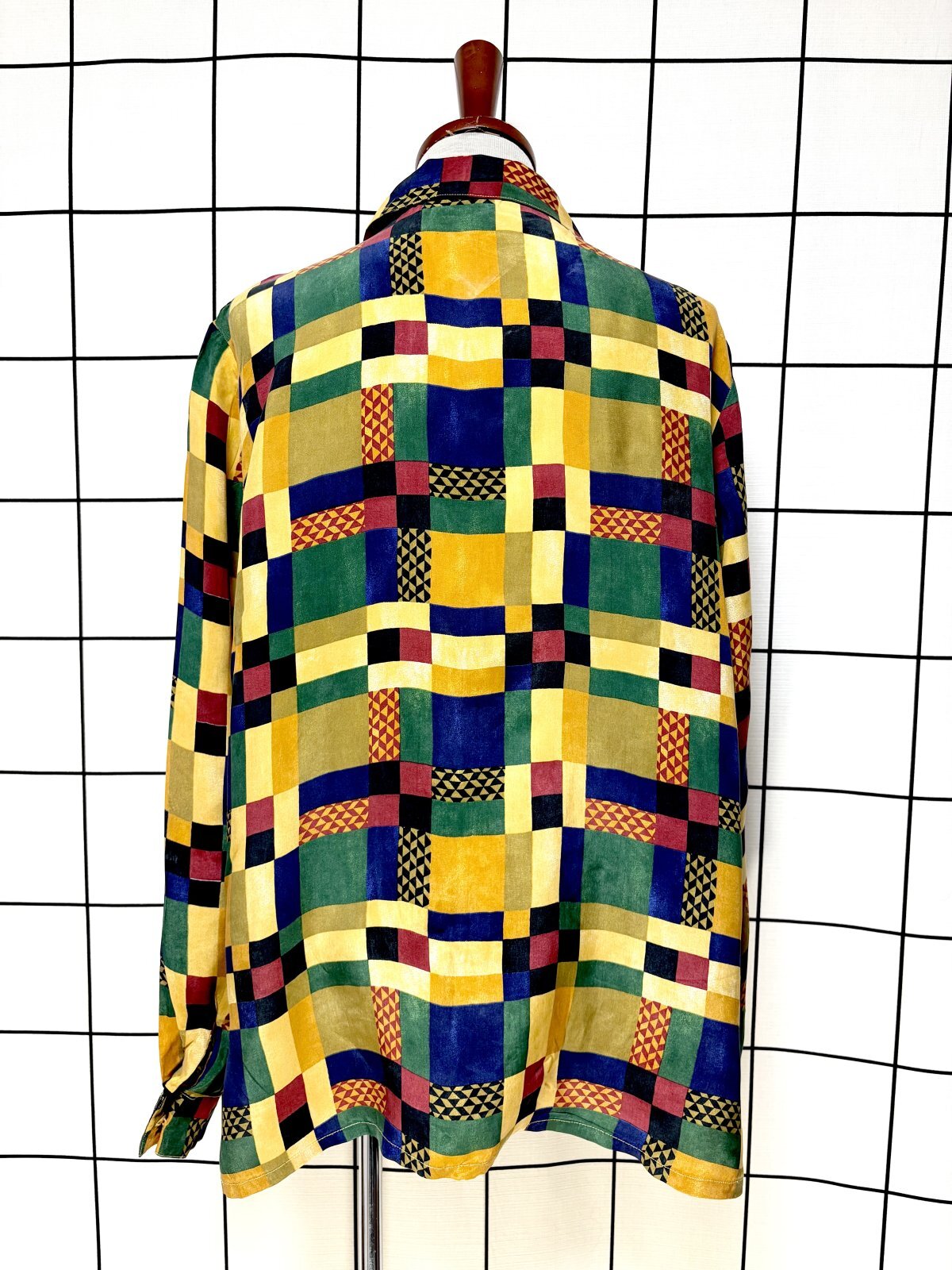 チェック柄 オーバーサイズコーデにも キュプラ レトロ ヨーロッパ古着 長袖 シャツ ヴィンテージブラウス [M10393]