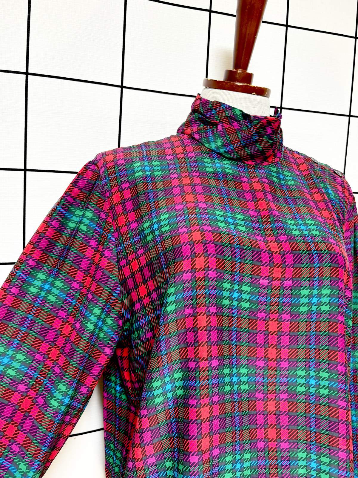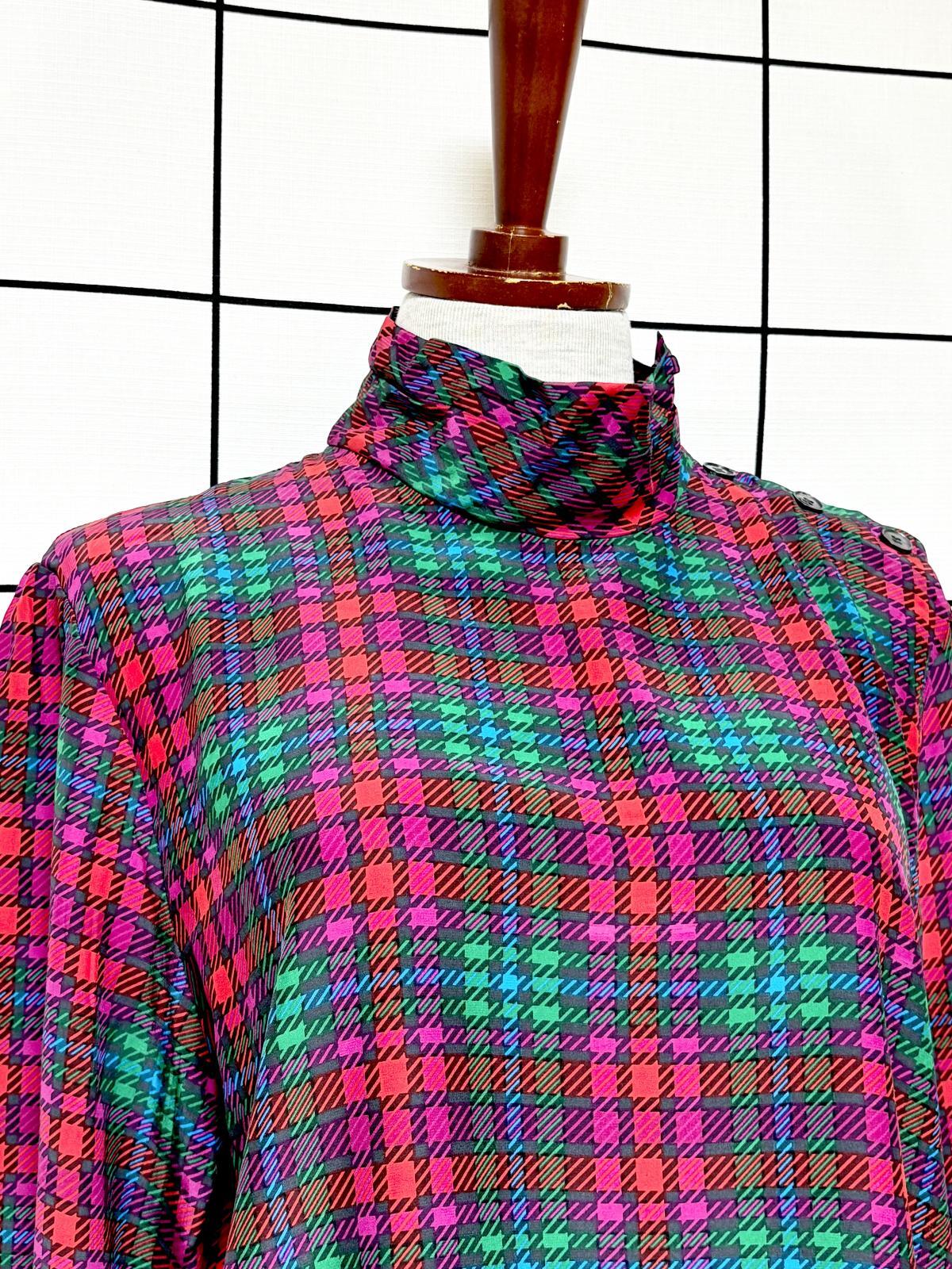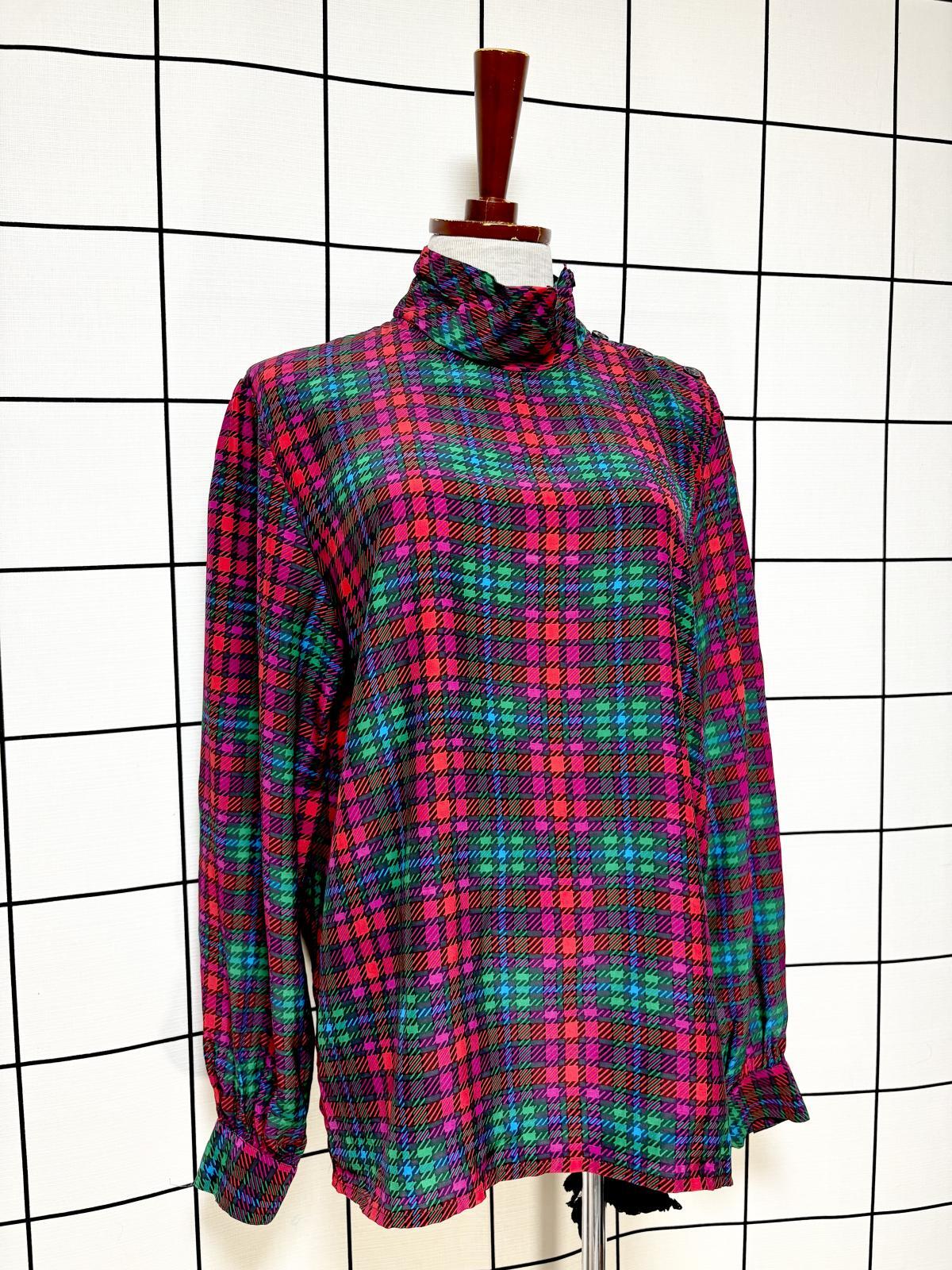 チェック柄 ハイネック レトロ プルオーバー シャツ USA古着 ヴィンテージトップス [M11134]