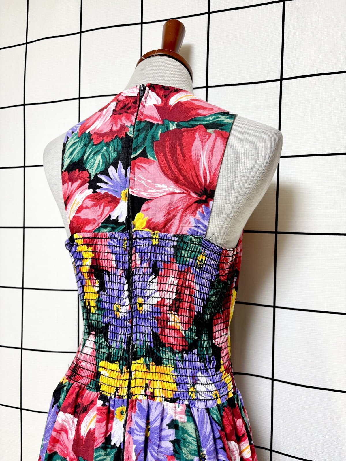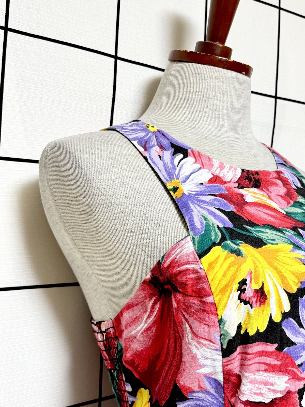 カラフル 花柄 ウエストゴム レトロ USA古着 ノースリーブ ヴィンテージワンピース