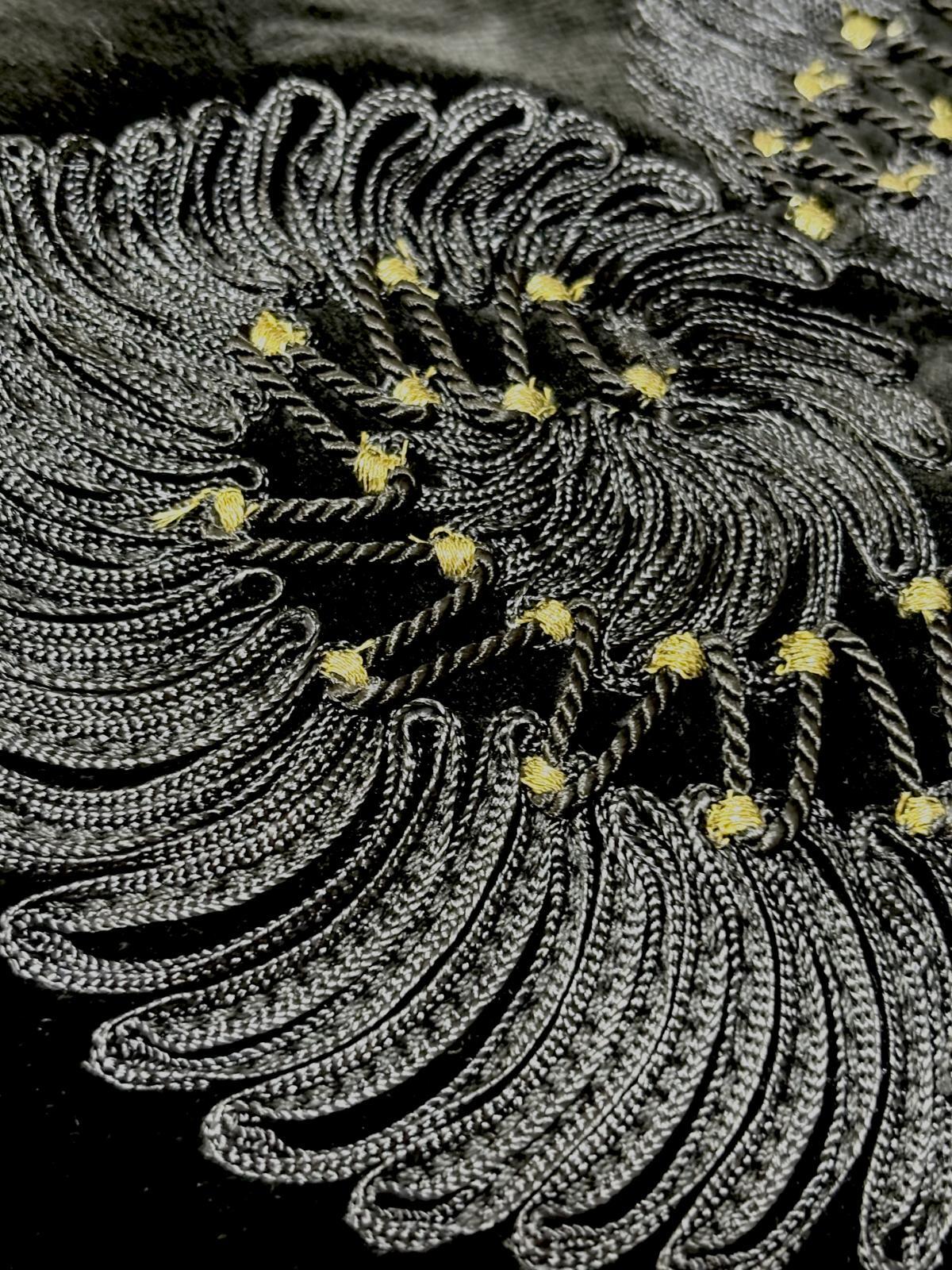 ブラックカラーのベロア生地にブレード装飾が高級感たっぷり。