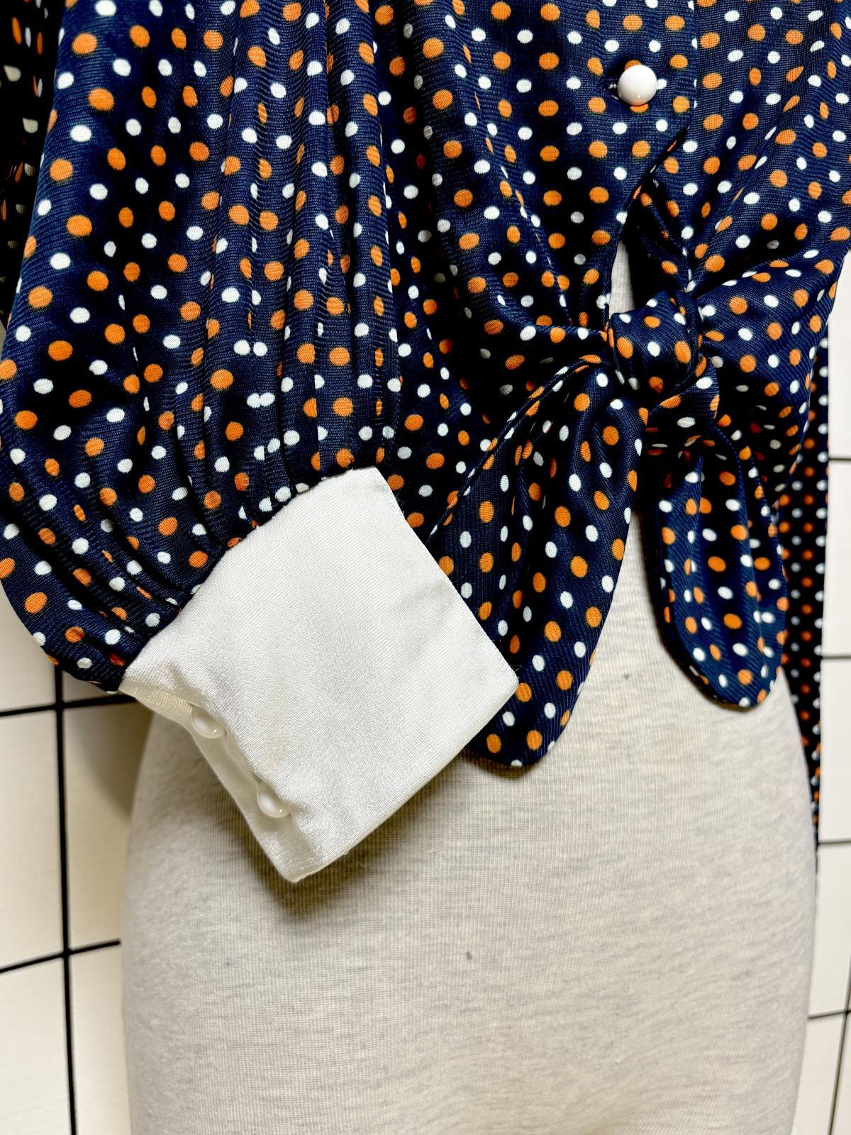 ショート丈 ドット柄 ウエストリボン ネイビーレトロ USA古着 シャツ ヴィンテージブラウス [11353]