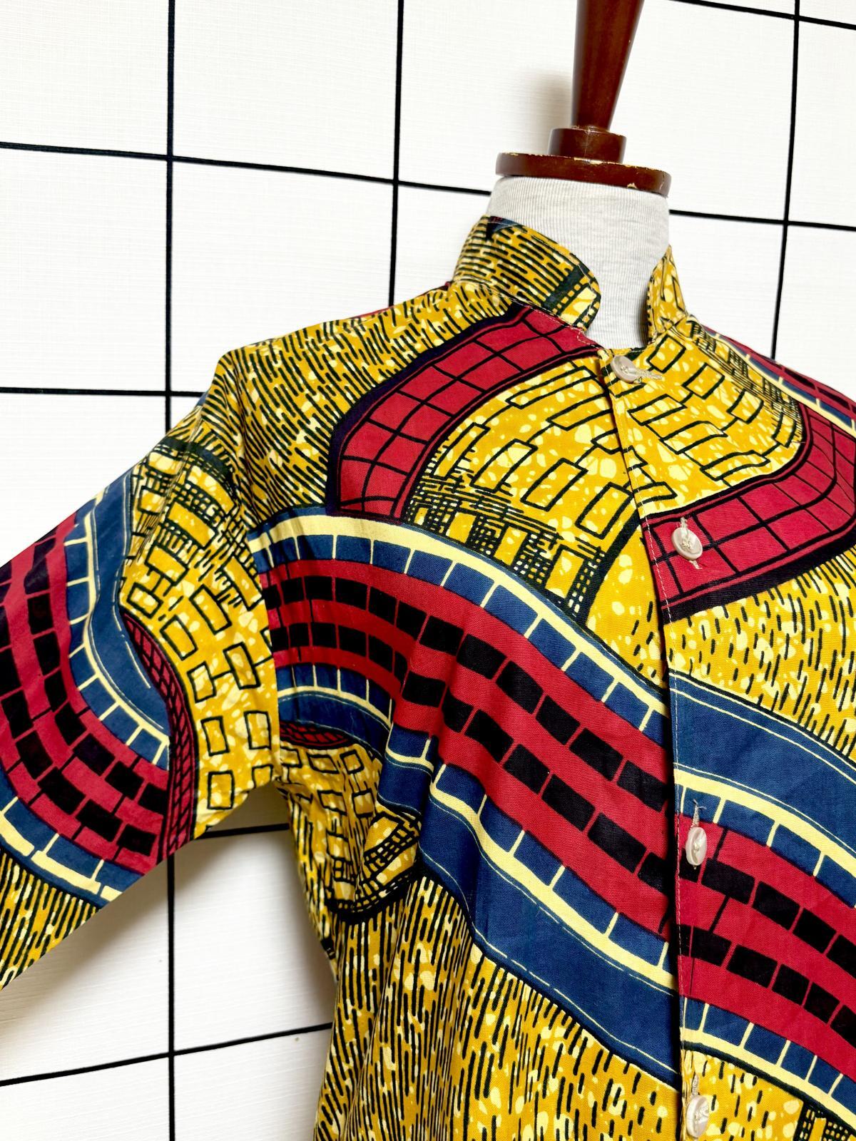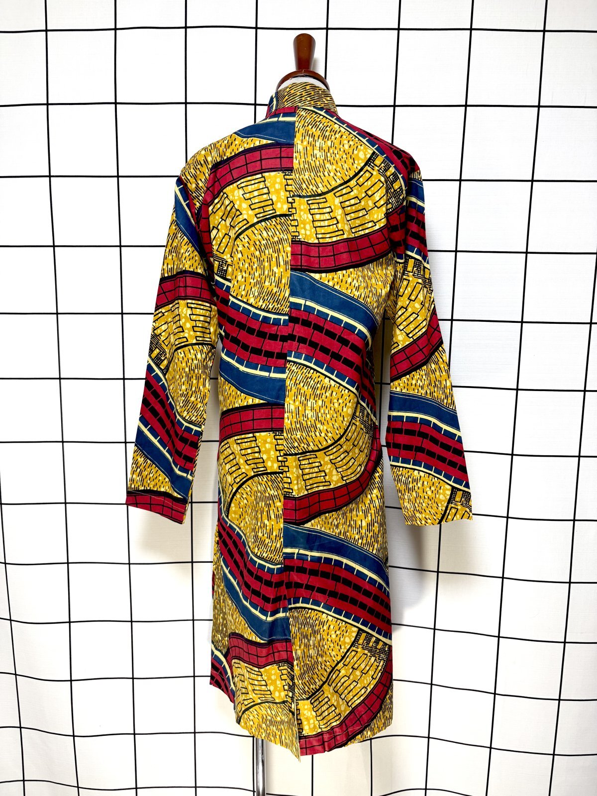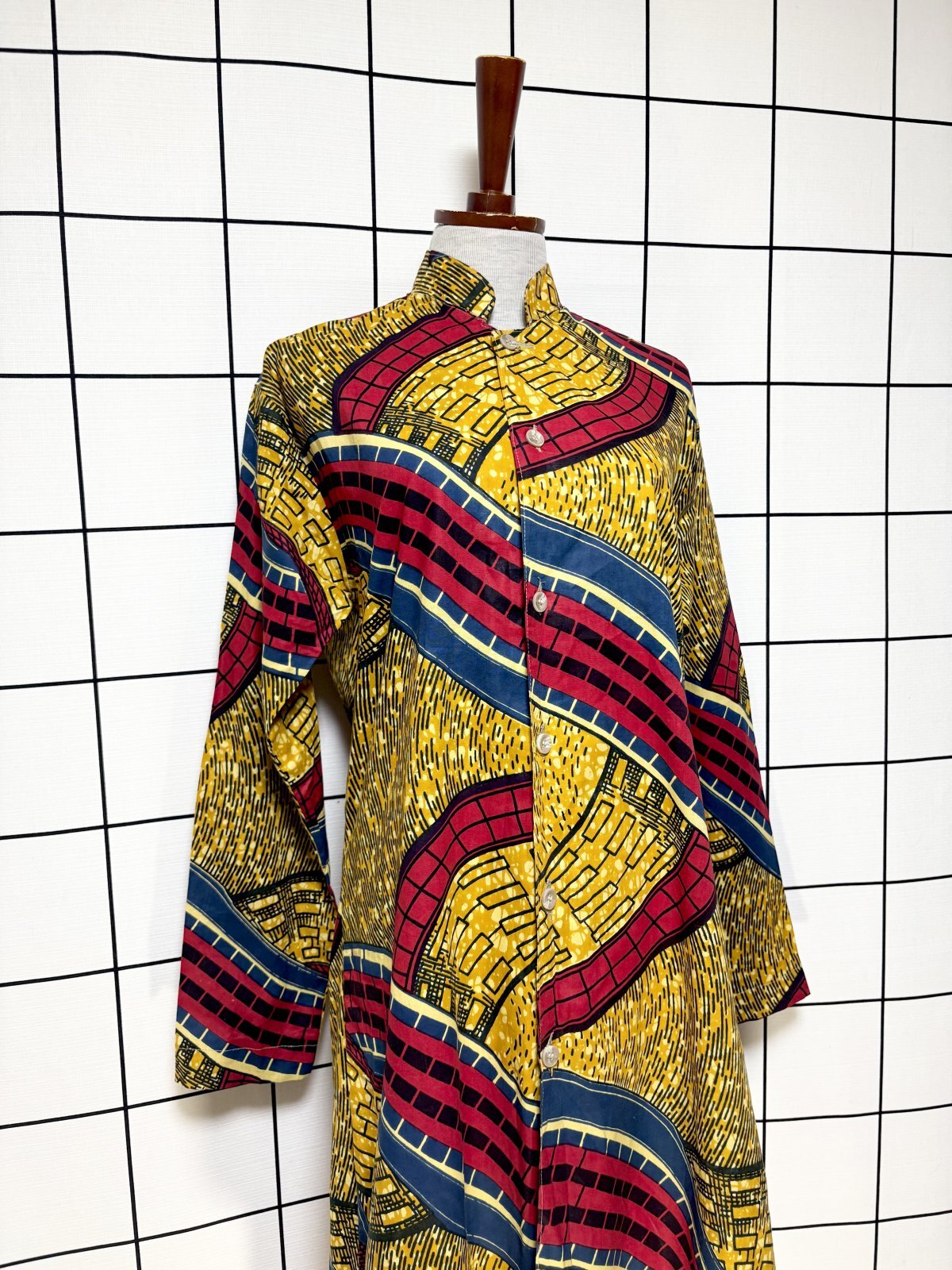 アフリカンバティック ドレス スタンドカラー 前開き 古着 エスニック レトロ ヴィンテージワンピース [M11367]