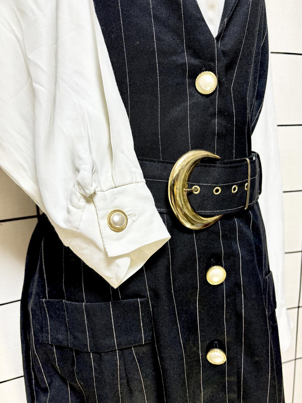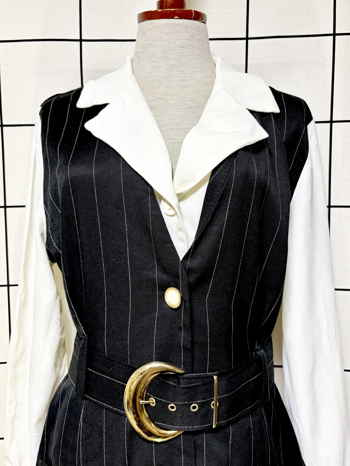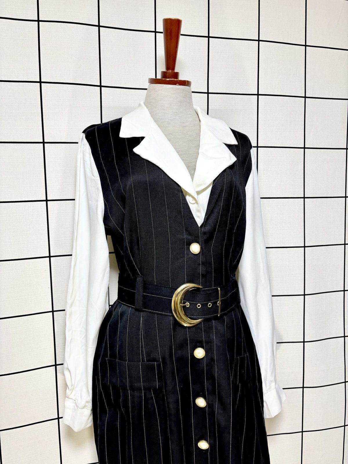 ベルトセット ストライプ 前開き モノクロ レトロ USA古着 ヴィンテージワンピース [M11439]